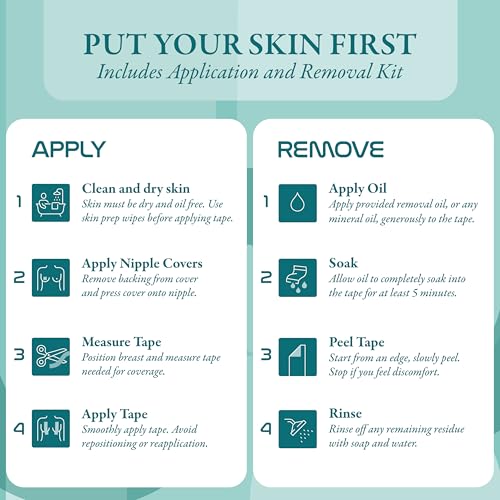 • Application AND Removal Kit.  BDY Tape outlasts and outperforms the competition with an easy-to-follow instruction guide that includes all the tools for better application and skin-safe removal. The Skin Prep Wipes clean skin to ensure proper adhesion​ while the Tape Removal Oil ensures safe and easy removal of tape after use. Plus, the included Silicone Covers protect the sensitive nipple area​.
