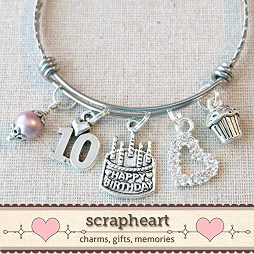 • MEANINGFUL CHARMS: This lovely expandable bangle comes with a Swarovski Crystal Pearl, a birthday cake charm, a cupcake charm, a 10 charm and a crystal heart charm.