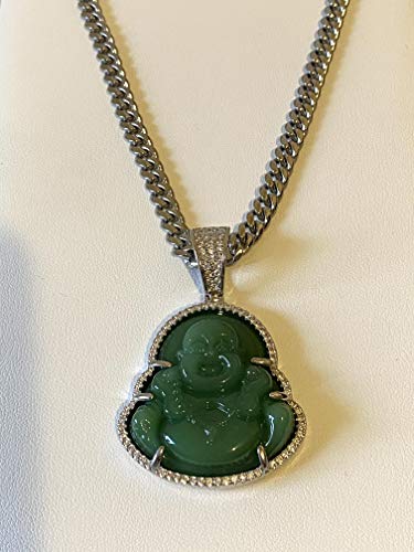 HOT ! Smiling Happy Iced Laughing Buddha Green Jade Pendant Necklace Miami Cuban Chain Cz Box Lock, Genuine Certified Grade A Jadeite Jade Hand Crafted, Silver Jade Medallion 6mm 20" Cuban Choker