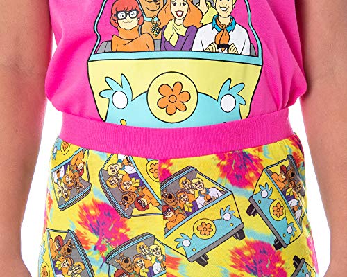 • VIVID COLOR, HIGH-QUALITY PRINTED DESIGNS - The bright hot pink v-neck cut shirt has a large front printed design of the 5 members of the supernatural solving team, Fred, Daphne, Velma, Shaggy, And Scooby-Doo riding in their iconic Mystery Machine van! The pajama pants feature a matching allover Mystery Machine and tie-dye pattern.