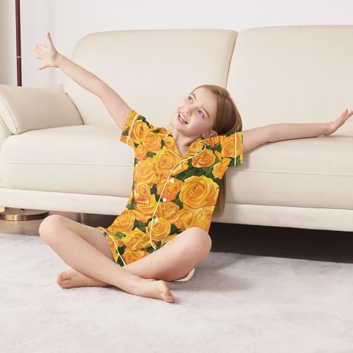 ALAZA Yellow Rose Flower Leaves Satin Pajamas Set Short Sleeve Button Down Sleepwear Summer Pjs 2 Piece 2
