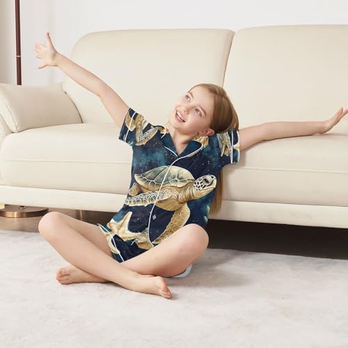 Satin Pajama Sets Short Sleeve Sea Turtle Starfish Pattern Button Down Silky Nightwear 2 Piece PJS 5-14Y 5