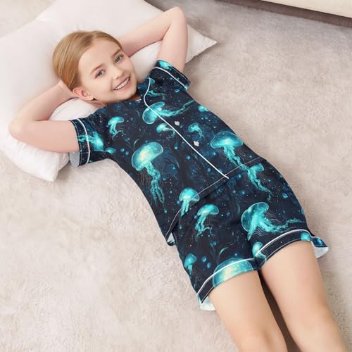 HOT ! ALAZA Blue Jellyfish Starry Satin Pajamas Set Short Sleeve Button Down Sleepwear Summer Pjs 2 Piece