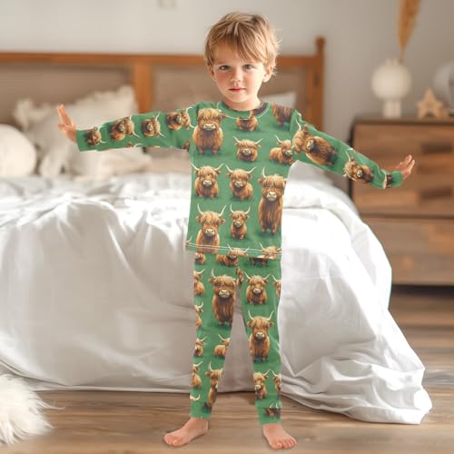 Pigsaly Pajama Set 2 Piece Spring Grass Cute Brown Highland Cow Cattle Pajama Sets Long Sleeve Pjs Sleepwear 3T 4