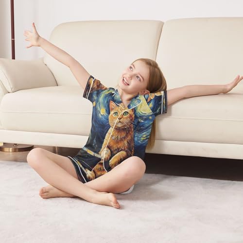 ALAZA Cat Moon Galaxy Oil Painting Van Gogh Satin Pajamas Set Short Sleeve Button Down Sleepwear Summer Pjs 2 Piece 7