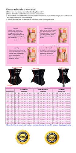 • We propose 4-5 inches reduction on your waist when putting the corset on. Please choose the corset size based on your waist. For example, for a 27 inch natural waist, Corset Size Small (24 Inch Corset Waist) fits for tight lacing. The corset size selected based on your waist measurements can fit you well as long as your Underbust & Hip measurements are within the range. Please use our size chart on the LEFT to choose the size.
