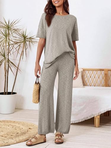 Tankaneo Women's 2 Piece Travel Outfits Casual Short Sleeve Knit Sweater Set Wide Leg Pants Lounge Sets Tracksuit 2