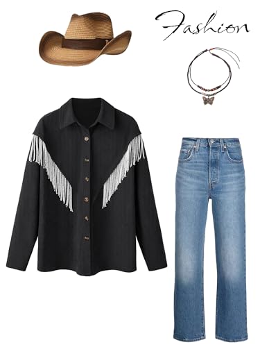HOT ! Nlife Womens Corduroy Nashville Sparkly Rhinestone Fringe Shacket Concert Outfits Long Sleeves Spakle Tassel Shirt Jacket