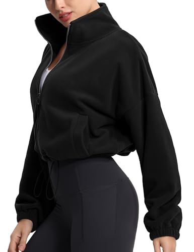 THE GYM PEOPLE Women's Fleece Cropped Jacket Full Zip Stand Collar Workout Short Sherpa Coats with Pockets Drawstring Hem 1