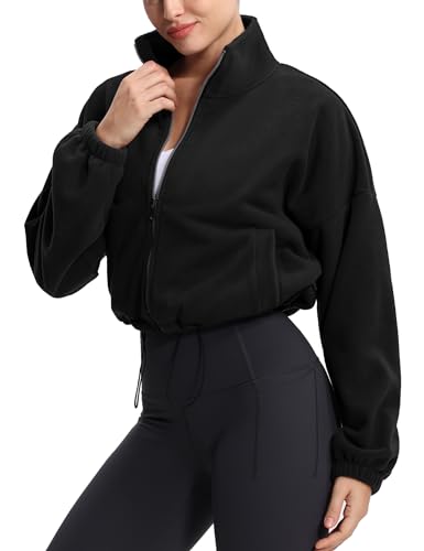 HOT ! THE GYM PEOPLE Women's Fleece Cropped Jacket Full Zip Stand Collar Workout Short Sherpa Coats with Pockets Drawstring Hem
