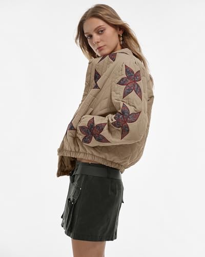 • Features: Delicate floral embroidery pattern, front button closure, fully lined, quilted, long sleeves with elasticated cuffs, cropped, loose fit, elasticated hem, 2 side pockets. Boyfriend style