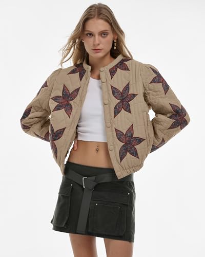Locachy Women's Casual Cropped Puffer Jacket Lightweight Flower Embroidery Winter Warm Quilted Jacket Coat with Pockets 1