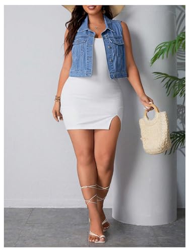 MakeMeChic Women's Plus Size Denim Vest Button Down Flap Pocket Jean Sleeveless Collar Crop Jacket Cowgirl Outfits 6