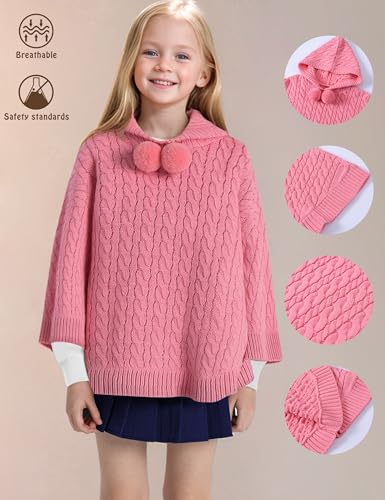 JSTEX Girls Poncho Sweater Cable Knit Cape Girl Hooded Pullover Sweater Holiday Kids Shawl Wrap for 6-12 2