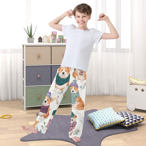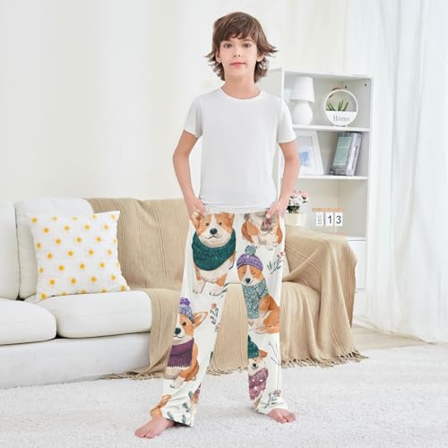 Corgi Dog and Winter Florals Boys Long Pants Soft Trousers Elastic Waist Kids Lounge Bottoms with Pockets S-XL 6