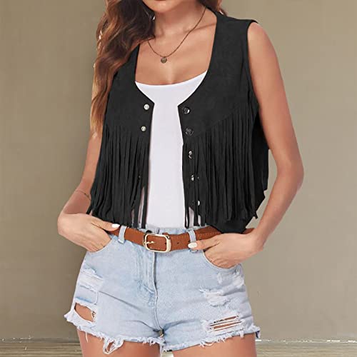 • Vifucz 0504* Black Fringe Cropped Vest Tops Teen girls Scoop neck Sleeveless Bolero Shrug Button short Jackets Hippie Rock Concert Cardigan Tops S