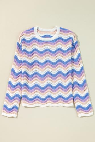 • ① 《Cozy Modern Style》: The Purple Stripe Wavy Pointelle Knit Drop Shoulder Sweater offers a modern take on classic knitwear, perfect for a casual and laid-back style. Its wavy stripes and pointelle knit design add a unique and delicate texture to the overall look.