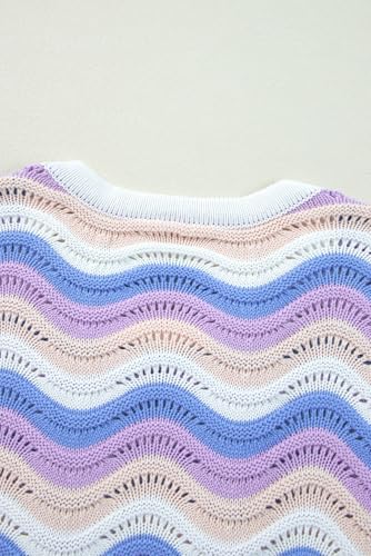 HOT ! Women's Purple Stripe Wavy Pointelle Knit Drop Shoulder Sweater