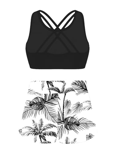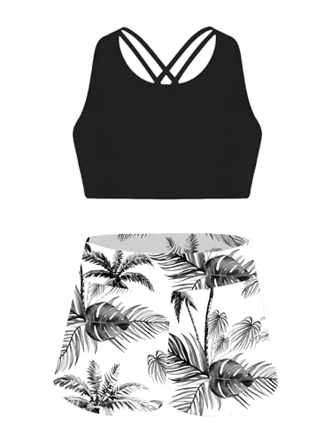 3 Pcs Floral Tankini for Kids Girls Solid Crisscross Bikini Top with Brief Swim Shorts Rashguard Sets 3