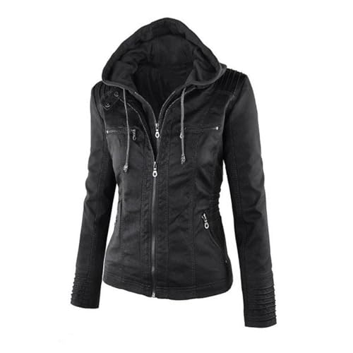 • Design: Trendy Hooded Bomber Coat Womens Jacket crafted from premium Faux Leather, featuring removable hood for versatile styling; Fall Jackets 2025 inspired design combines biker aesthetics with modern Outerwear functionality, including front panel with exposed zipper and double snap collar for edgy appeal.