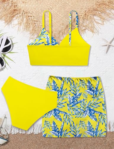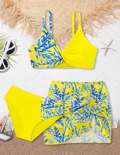 Girls Swimsuit Tropical Floral Bathing Suit for Girls 3 Pcs Swimwear Cross Bikini with Drawstring Cover Up 8-16Y 3