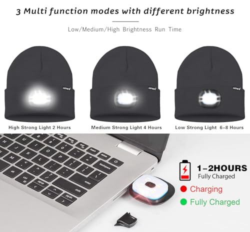 • MULTIFUNCTION VISIBILITY & SAFETY:You can adjust the brightness by pressing the button. There are 3 modes for you to choose the most suitable brightness. It can last up to 6-8 hours in the lowest level, 4 hours in medium level and 2 hours in the highest level.No longer re-purchase and change batteries for your light up beanie, only a standard USB port from the computer or mobile phone charger. press the button in the middle of LED light to switch on/off.