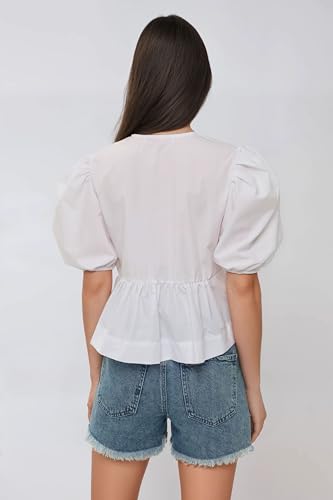 HOT ! Hiccup Cotton Crew Neck Blouse with Bow Detail