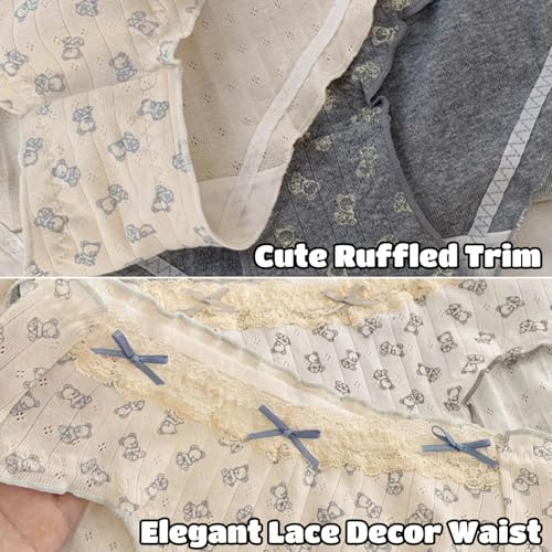 • Adorable Design & Theme: This delightful 4-pack set features breathable cotton that won't feel tight or constricting, paired with cute cartoon bear designs inspired by Korean fashion trends. Each pair is adorned with frilly lettuce edges and an elastic waistband, creating an adorable aesthetic reminiscent of Japanese schoolgirl fashion. The ruffled edges enhance your curves gracefully, adding a touch of elegance and sophistication