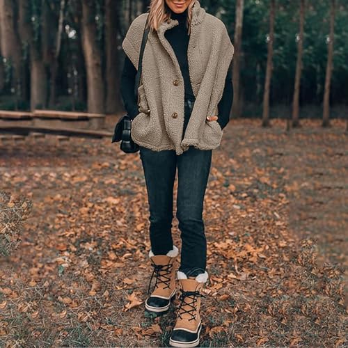 HOT ! Womens Fleece Vest Casual Oversized Button Down Sherpa Vest Stand Collar Sleeveless Fuzzy Jackets with Pockets
