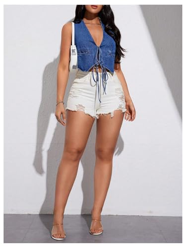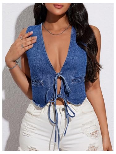 HOT ! MakeMeChic Women's Denim Vest Tops Y2K Tie Front V Neck Asymmetrical Cropped Jean Vest Jackets