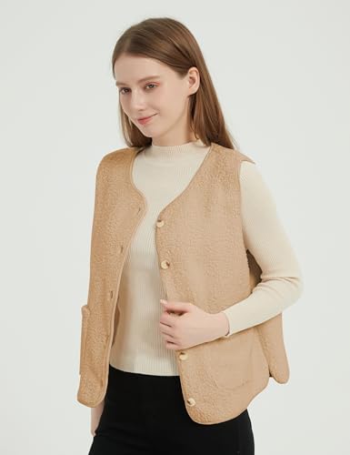 Womens Fall Winter Fleece Sherpa Lightweight Vest Cozy Sleeveless Button Down Fuzzy Outwear Vests with Pockets 1