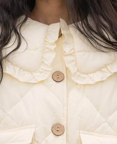 Womens Quilted Puffer Jacket Frilly Peter Pan Collar Button Lightweight Cream Cute Fall Coat with Pockets 6