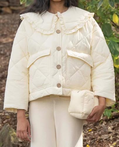 HOT ! Womens Quilted Puffer Jacket Frilly Peter Pan Collar Button Lightweight Cream Cute Fall Coat with Pockets