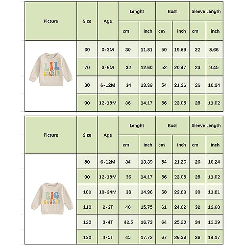 • Features: Baby big cousin sweatshirt 6-12 months, 12-18 months, sweatshirts for toddlers 18-24 months, big cousin t shirts for kids 2-3t, 3-4t, 4-5t, big cousin long sleeve tops, colorful letter, long sleeve, crewneck, fashionable. Our sweatshirts are sure to bring smiles and laughter to your kids' faces.