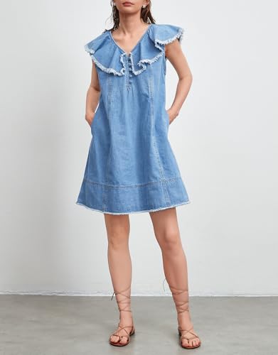 Kedera Denim Summer Dresses for Women Ruffle Short Sleeve V Neck Mini Jean Dress Romper Babydoll Jean Sundress 3
