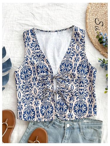 HOT ! OYOANGLE Women's Plus Size Boho Floral Print Tie Front Vest Tank Top Vintage V Neck Sleeveless Crop Tops Waistcoat