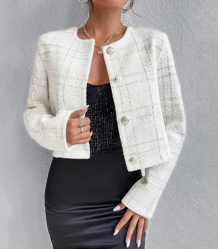 • ebossy Womens Elegant Chunky Tweed Casual Slim Checker Pattern Blazer Jacket features round neck, long sleeve, classic contrast color tweed pattern, cropped length, lined.