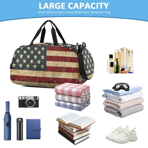 HOT ! Kids Sports Duffel Bag for Boys & Girls - Retro American Flag 100% Polyester Gym Bag with Separate Shoe Compartment, Adjustable Shoulder Strap, Compact Travel & Workout Gear Bag
